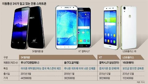 SK텔레콤은 오는 22일 중국의 TCL-알카텔이 만든 스마트폰 '쏠(Sol)'을 자사 가입자들을 위한 전용폰으로 내놓는다. 15만대 이상 팔린 '루나'의 후속작이다. KT와 LG유플러스는 한 달 전 각각 삼성전자의 '갤럭시J7'과 화웨이의 'Y6'를 전용폰으로 내놨다.