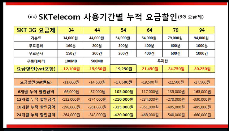 가령 sk텔레콤 고객이 2년 약정을 걸면 3세대 스마트폰용 올인원 54요금제를 쓰면 17500을 할인해준다..